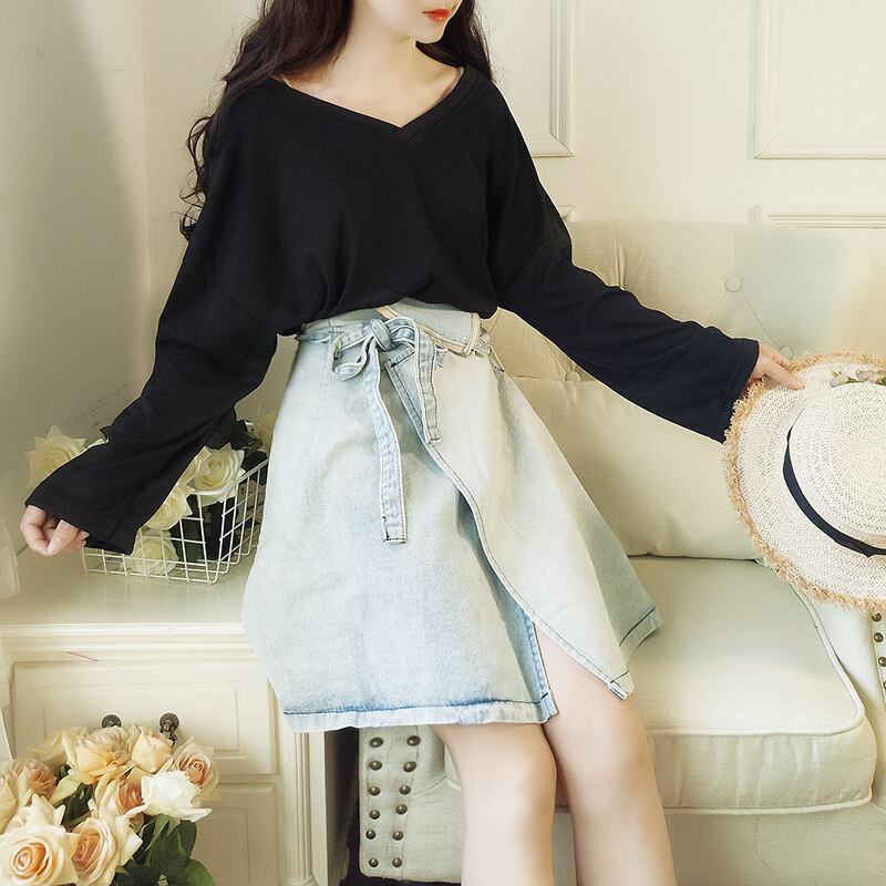 色:ホワイトトップ+ブラックデニムスカート,ブラックトップ+ブルーデニムスカート